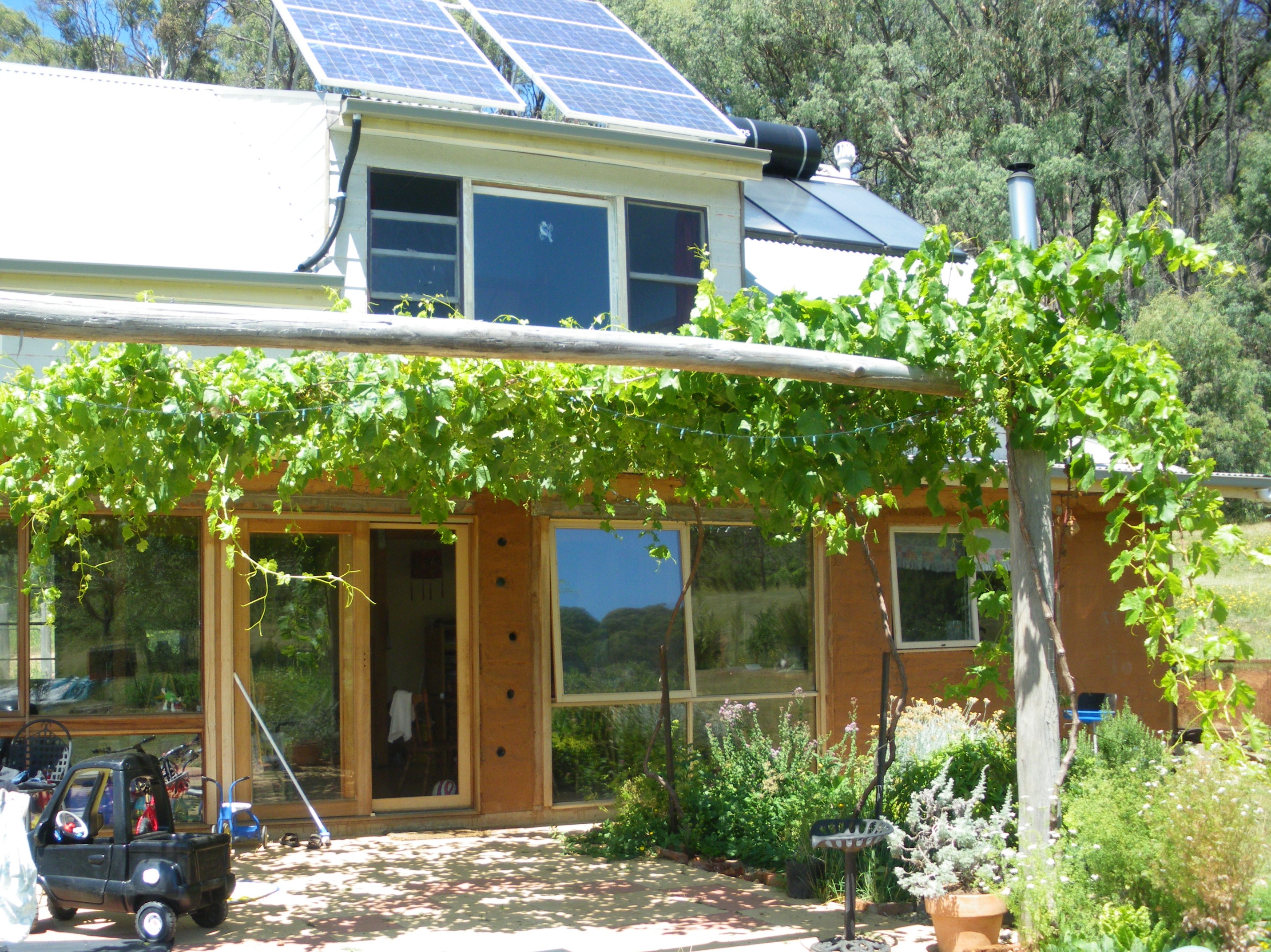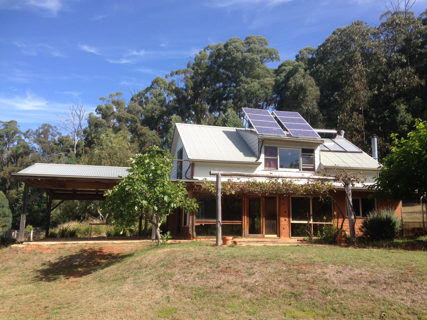 This cosy and comfortable house needed to be very simple to build, with excellent thermal performance in a cold climate that receives regular winter snow. Off grid services were also required in this bush/farm location. The house was orientated Northwards to maximise winter solar gain, and thermal mass and wood heating was used. Upstairs bedrooms are passively heated by the wood heater flue and the natural tendency of heat to rise, and are heavily insulated. The house is powered by off grid solar PV system, solar hot water, rainwater storage, wood heating and wood & gas cooking. A large outdoor living area to the East features summer shade, winter sun and captures expansive mountain views. High bushfire risk is managed by position in the landscape, maintained fire breaks, material choices, building sealing, timber coatings and sprinklers.