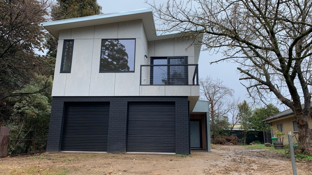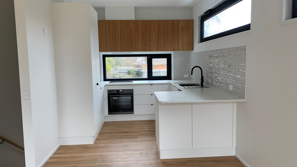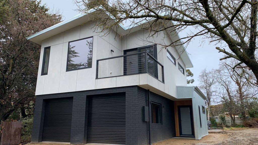 A creative reimagining of a very solid – but very ugly – 1960’s brick garage – into a light and bright, highly efficient, 2 bedroom dwelling, maximising in-town convenience, large garden space, great winter solar gain and natural light, and a lovely outlook through treetops and across open public parklands. A class leading 7.4 energy star rating (whilst using only conventional and cost effective building technology) reflects the considered design. A significant design feature of this house is the excellent use of a compact footprint – the building achieves independent bedroom and bath zones for two bedrooms, car and storage space, and clearly defined living and lounge zones, whilst retaining over half the <500m2 block as garden and outdoor living.